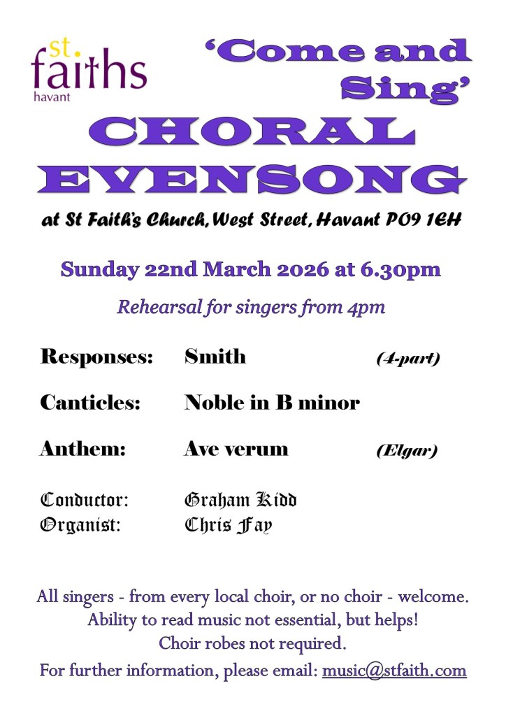 Other Musical Events Come and Sing Choral Evensong will take place on Sunday 22nd March at 6:30pm at St Faith’s Church Havant. Share this: Share on X (Opens in new window) X Share on Facebook (Opens in new window) Facebook Like Loading...